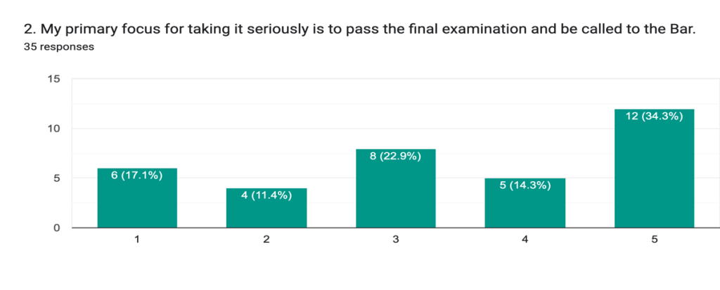 This theme continues at the Ghana School of Law in a more refined form. Students identified key areas such as advocacy, procedure, client management, and legal ethics as areas where they would have preferred more practical engagement. Notably, while ethics is formally taught at this stage, it still appeared among the areas students felt least confident about.